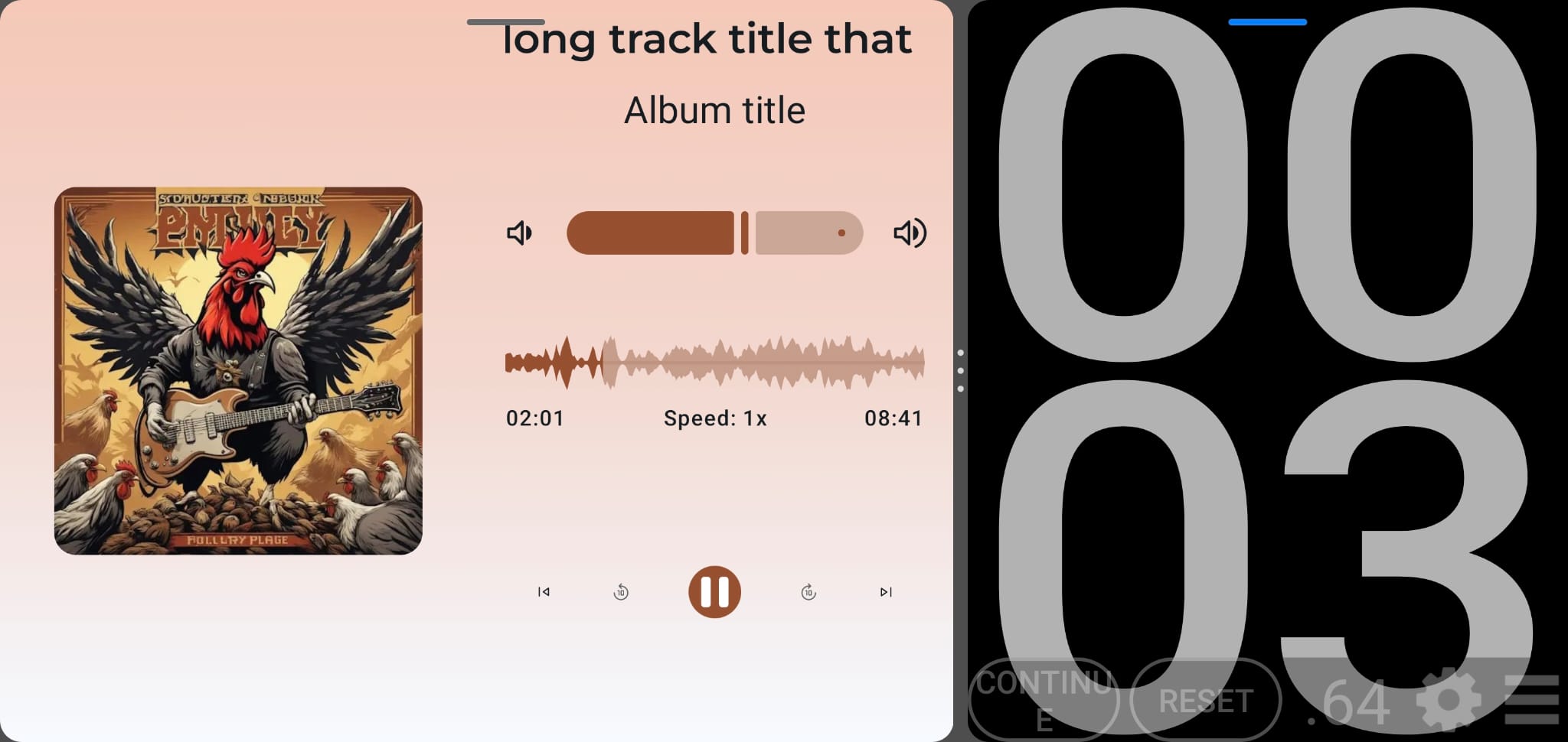 Rationale: I use my Android phone with two apps playing at the same time, namely a music playing App and a large timer. The music App takes up about 60% of the screen, so each of the columns (the left having the thumbnail and the right having the controls) has about 30% of screen estate each.