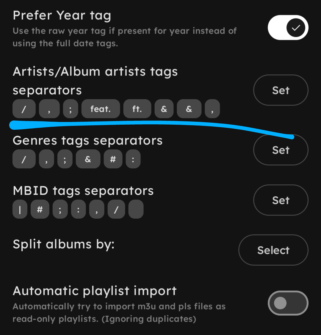 I used to use oto and I separated artist using commas. Wanted to know if I could change the symbol that separates artists, but I don’t think it’s an option. The oto app is currently a buggy mess for me rn so I’m using syphonium for now.