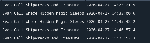 2nd: Me playing 3 times, waiting one minute (Longer than the song’s duration) and playing 3 times again (Note the duplicated timestamps weren’t divided into 2)