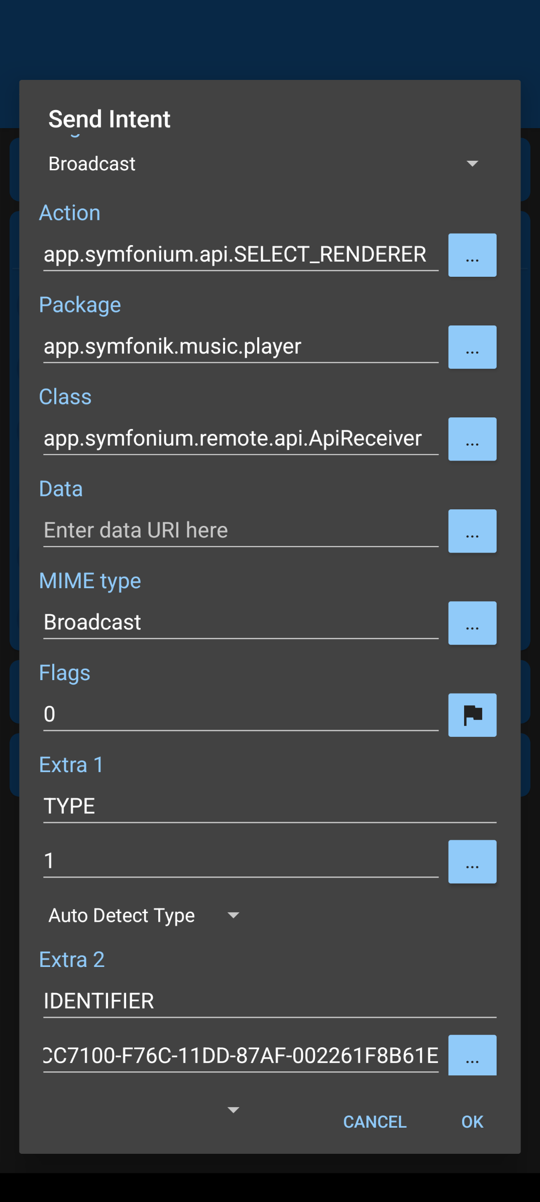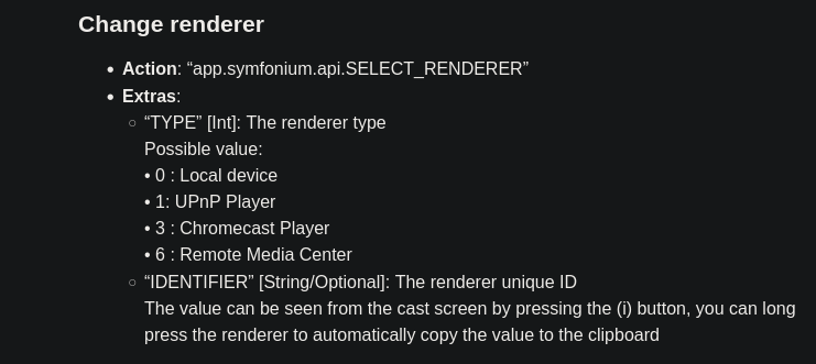 I have an macrodroid task that sets the renderer and starts the playback. But sadly it just plays on my phone, instead of the device i have selected using the intent. I tried it with and without setting the indentifier, but that doesnt change anything.