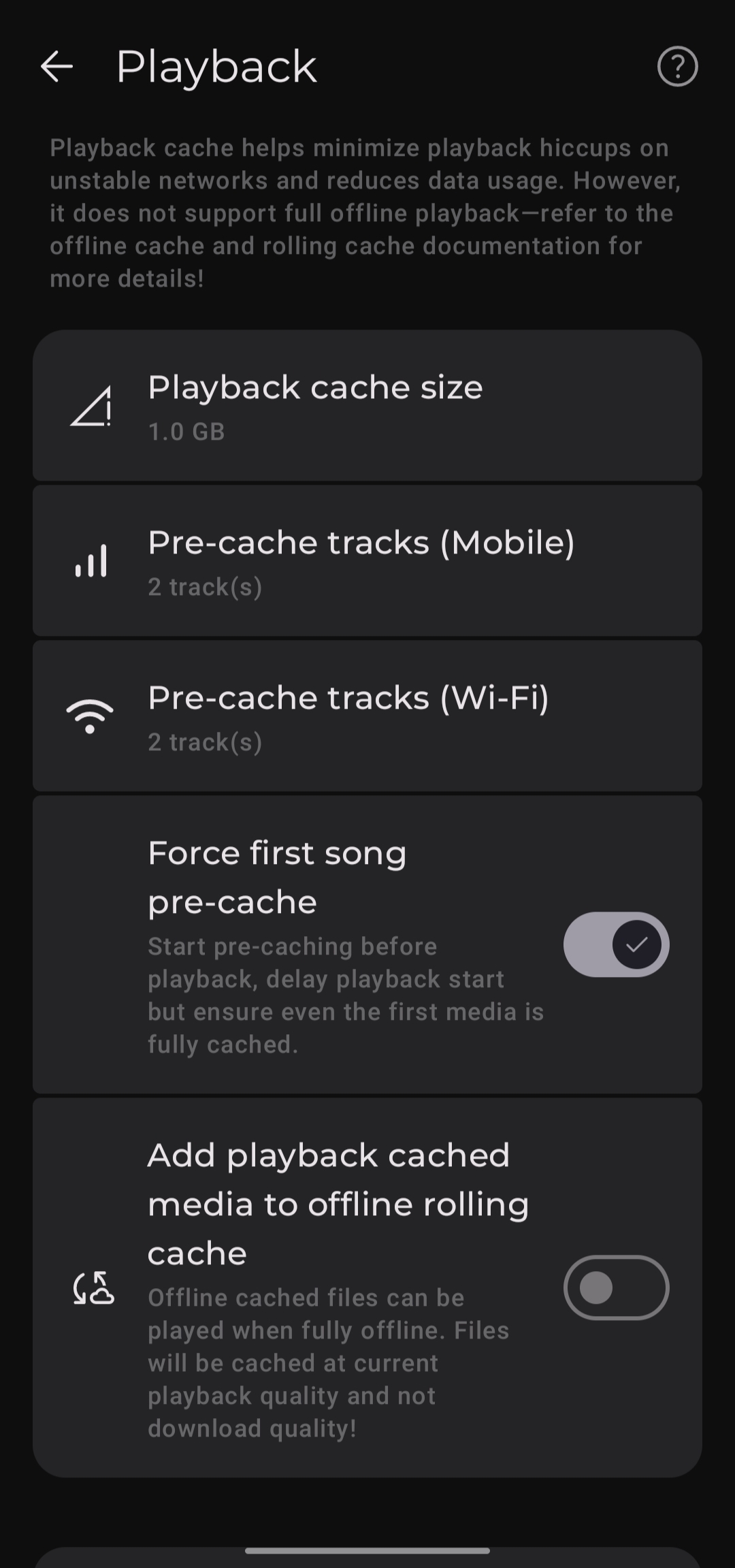 It doesn’t work as intended, still the song plays with pre caching and buffers time to time. My internet is fast still it happens. It doesn’t happen with Emby official app though