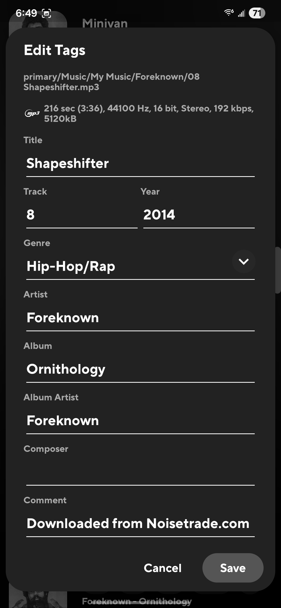 Edit Title, Track name, Year, Album name, Artist name, Track number.