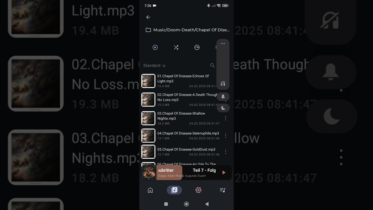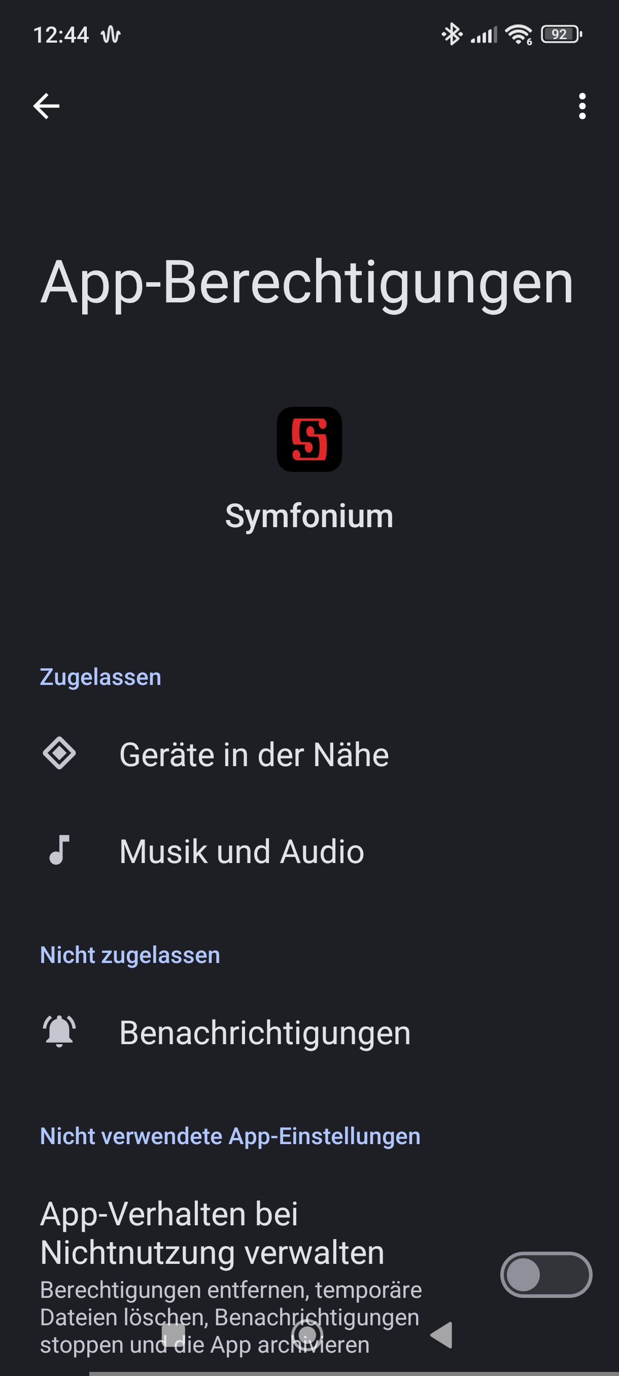 Here is a screenshot showing the given permissions for Symfonium. Files are stored on the mobile device. Files transfer to the device via USB cable connected to PC and the device. Files added to the current playlist using the library/files view.
