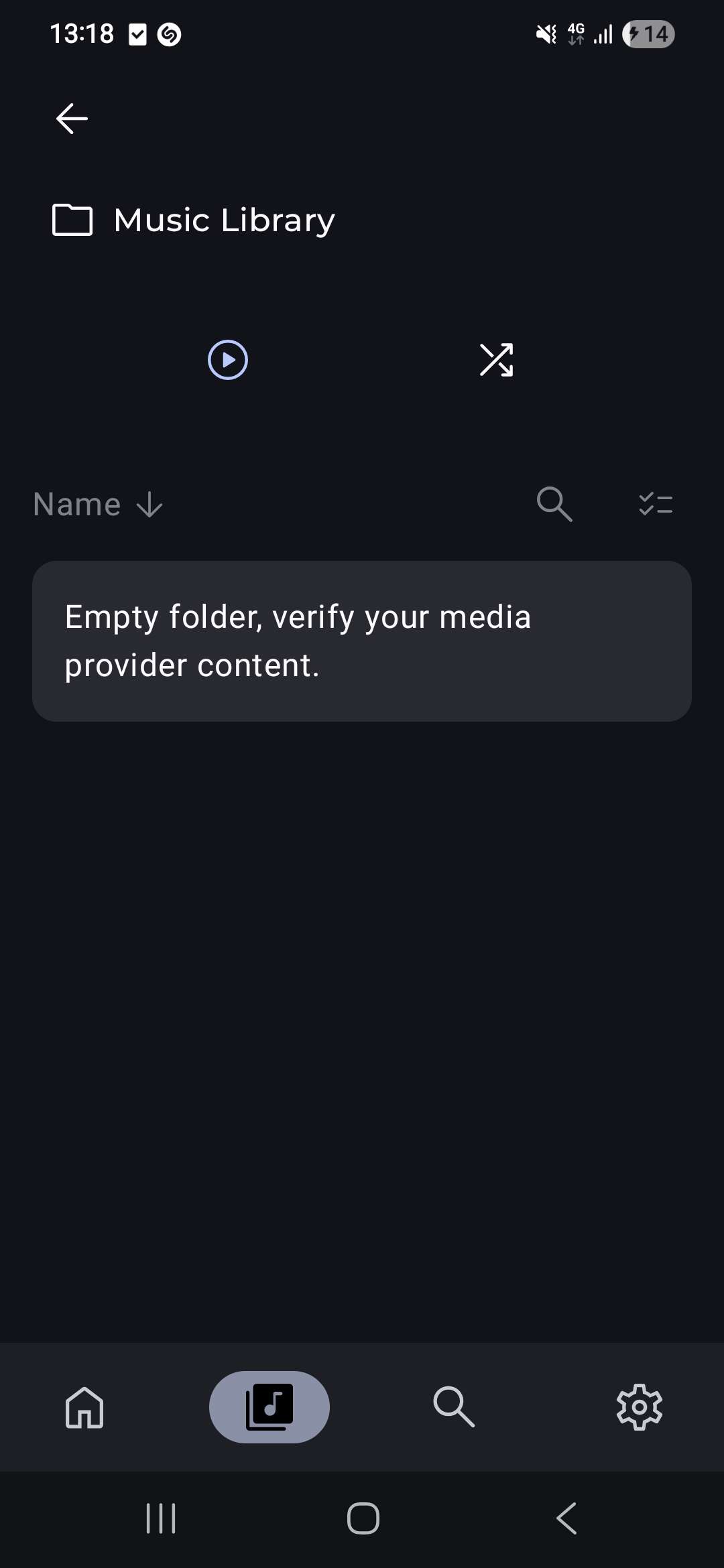 instead of showing music, it says “Empty folder, verify your media provider content”.