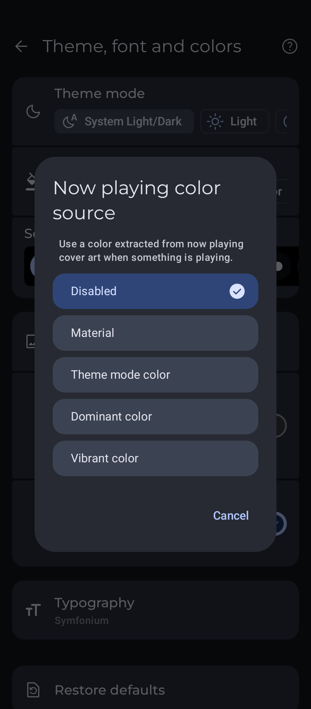 I would like an option to have the adaptive primary color used in NPS screens to match whichever palette the theme’s “Now playing color source” is set to.