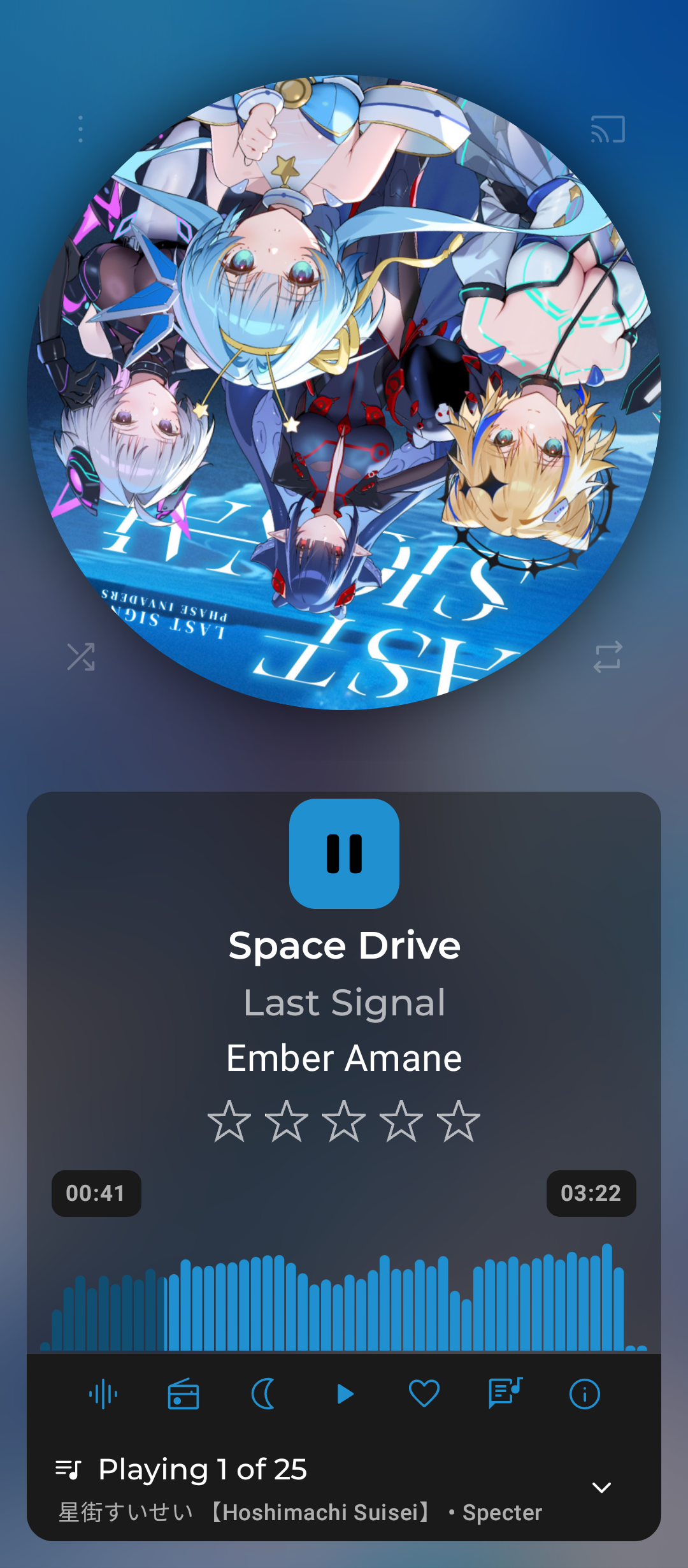 Pic 1: Big button at top shows that media is currently PLAYING, so button changed to pause icon. Little button (center of Bottom Bar) is still stuck on “play” icon.