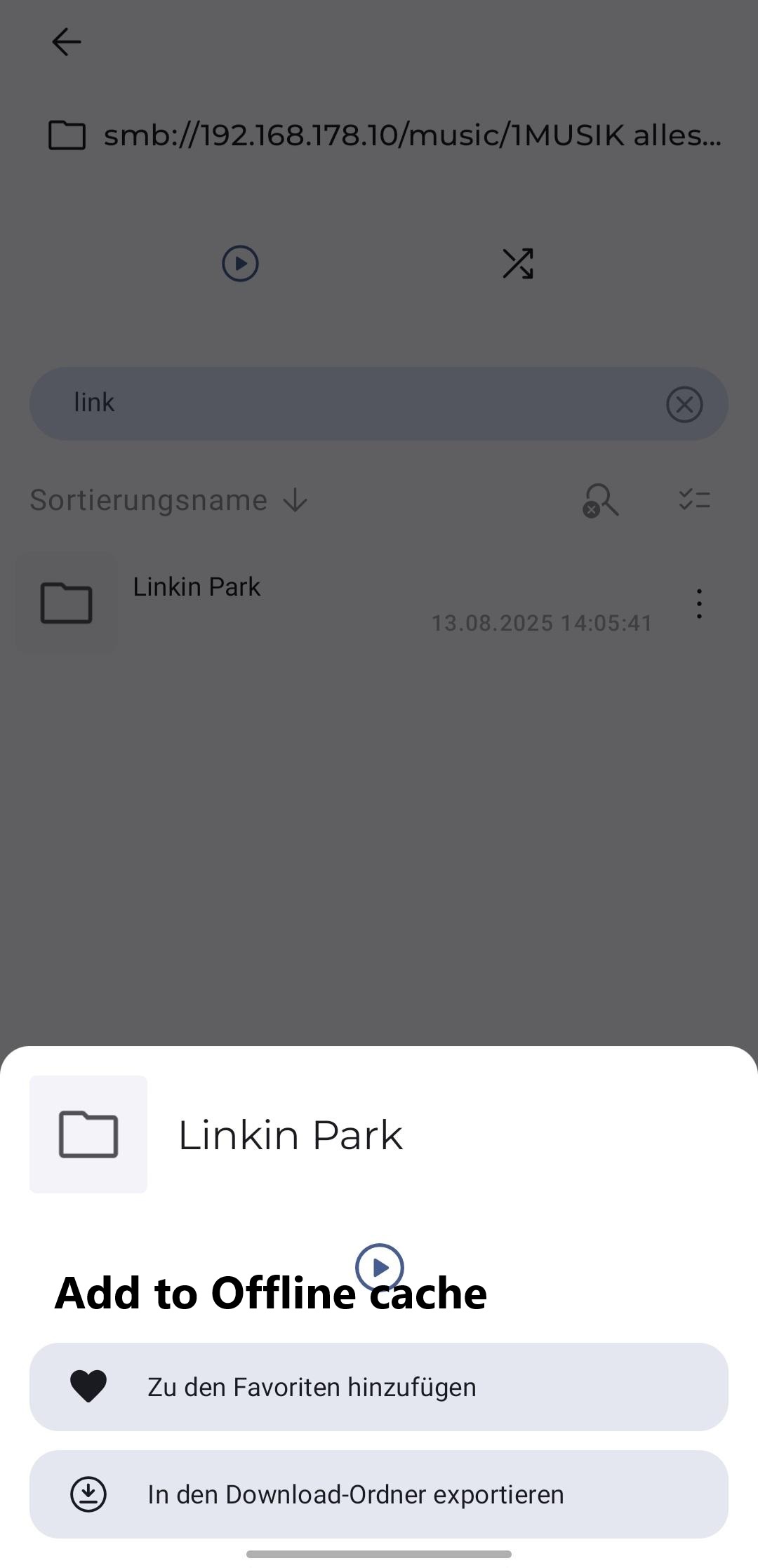 There should be an option in the SMB share file browser (folder structure) to cache an entire folder including subfolders for offline use. This would allow browsing the folder structure and playing cached content while offline. Ideally, the offline cache would automatically update when files are added or deleted on the SMB share. (This feature might also be useful for WebDAV.)