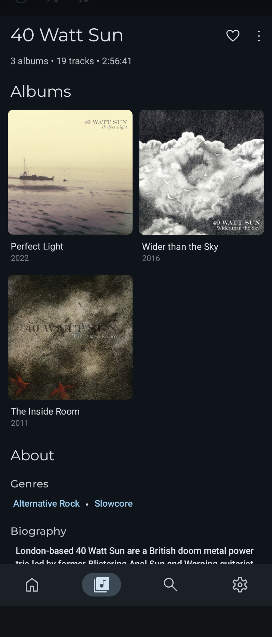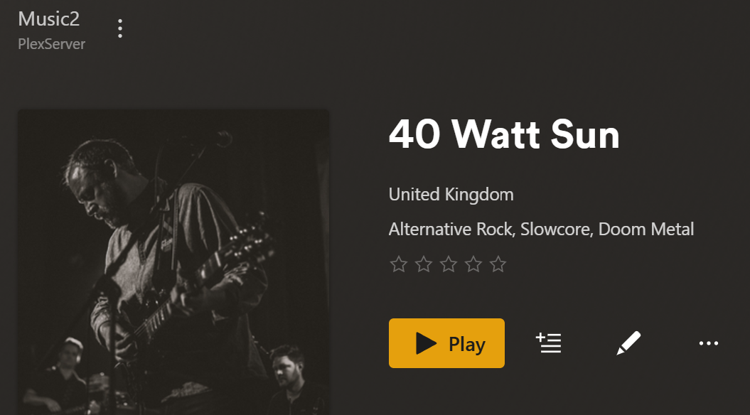 <Directory ratingKey="5734" key="/library/metadata/5734/children" guid="plex://artist/5d07bd86403c6402905f73ff" type="artist" title="40 Watt Sun" summary="London-based 40 Watt Sun are a British doom metal power trio" index="1" lastViewedAt="1754525433" thumb="/library/metadata/5734/thumb/1754497966" addedAt="1754497845" updatedAt="1754497966">