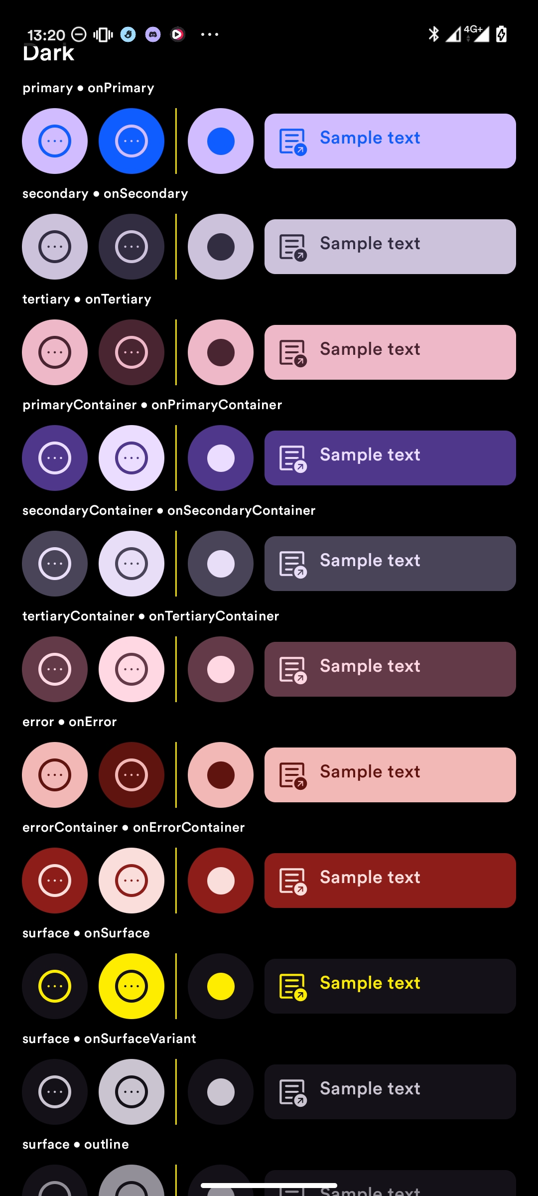 Screenshot 2 shows my (newly saved) theme with my chosen onSurface color (yellow) in the edit theme section.