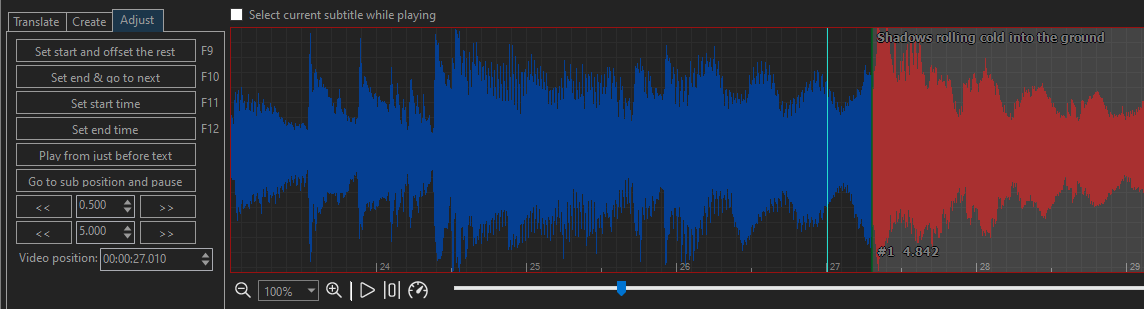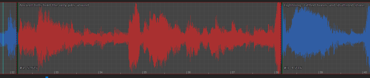 Now if I open this lrc file in SubtitleEdit, the wavebar quickly reveals that the lyric lines from MusicBee consistently start ~300ms too late.