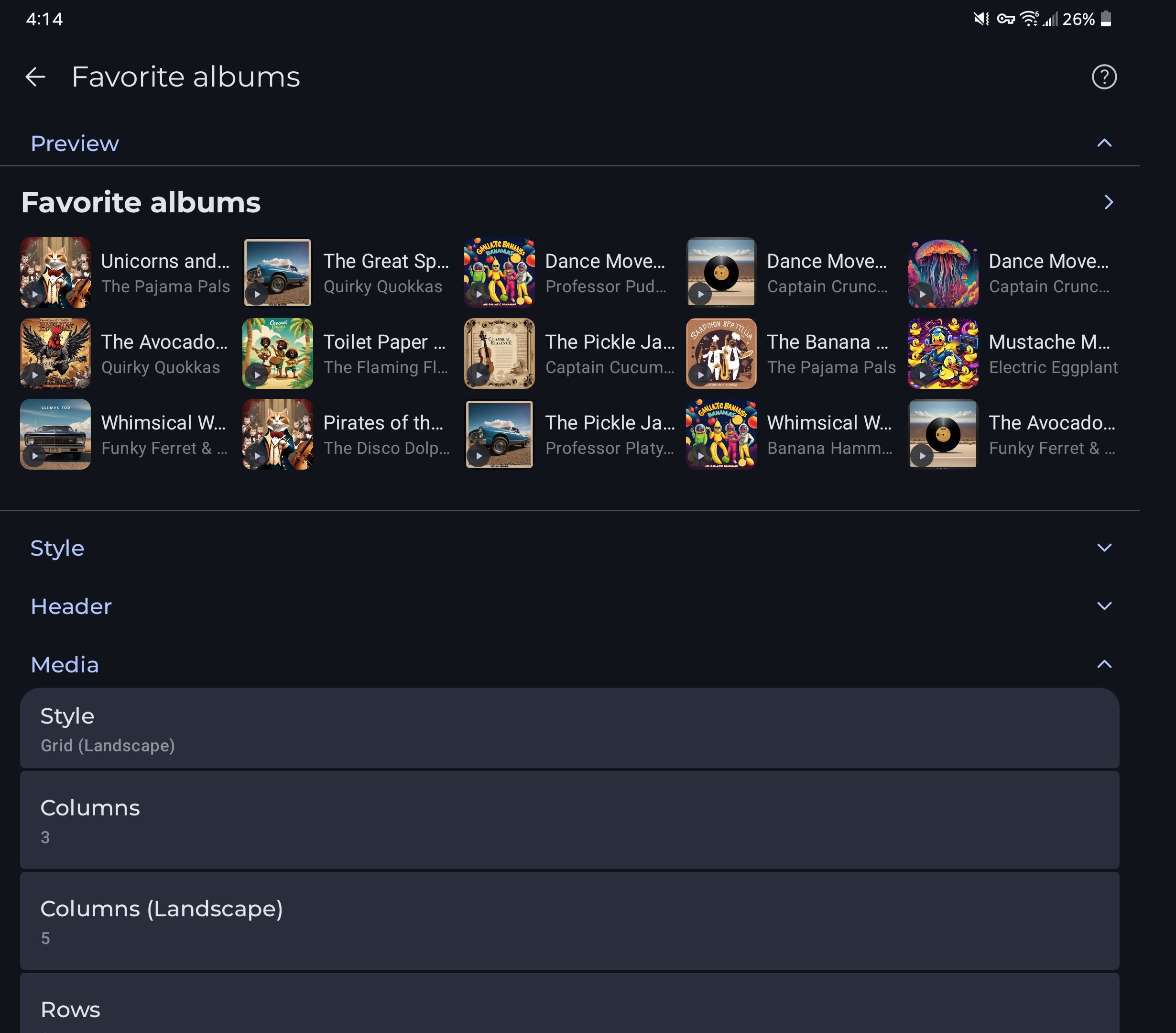 Device in landscape orientation, set any Home page item to Media Style “Grid (Landscape)”. Set “Columns” to “1” and the preview will show all items shrink.