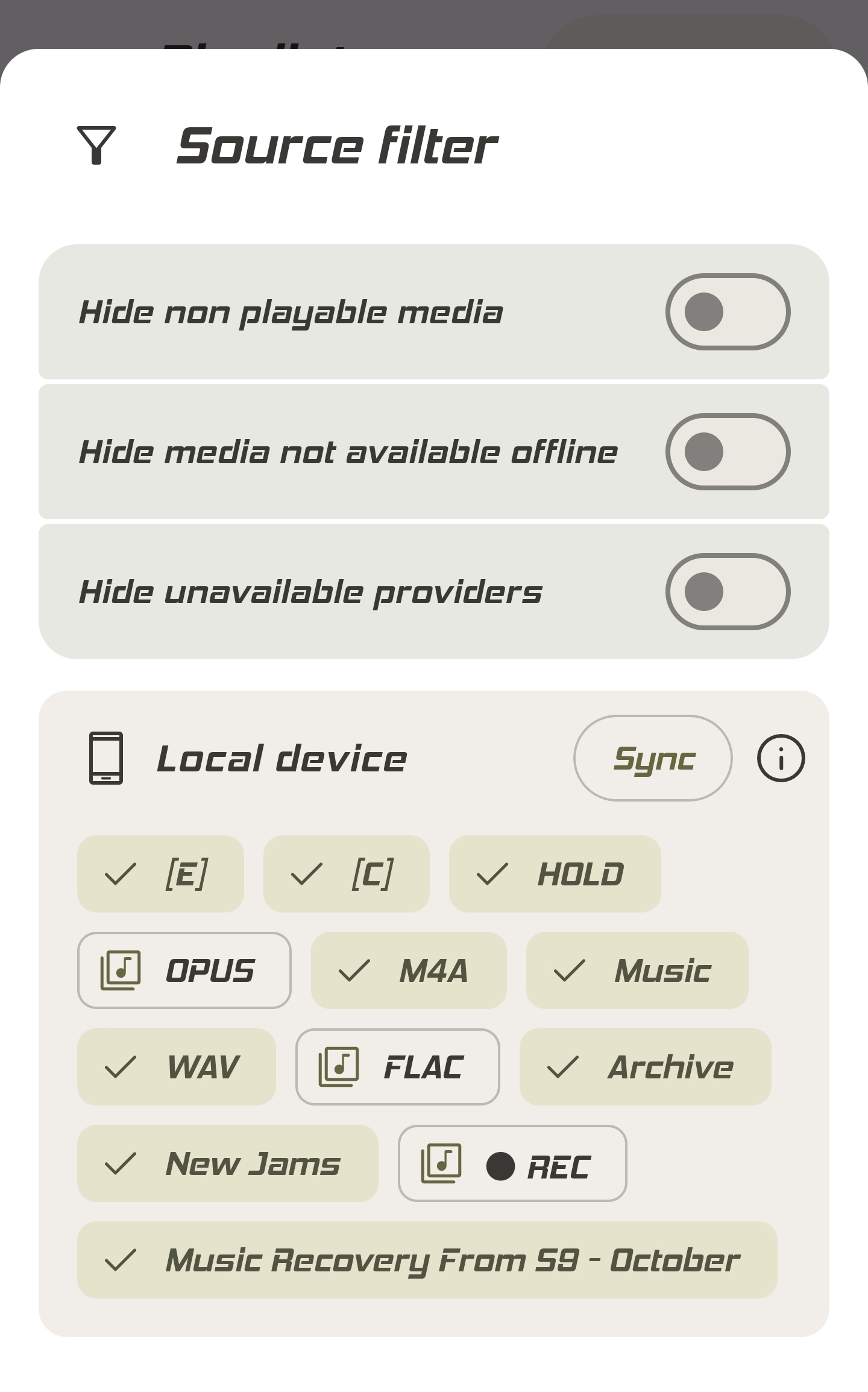 I have smart playlists which feature multiple versions of tracks (Clean vs Explicit & M4A vs OPUS). I’m often editing the playlists provider / library to fit the needs of the day or situation & it would be nice to quickly toggle smart playlists based on the Global filters selected, then I would not need to edit the global filters and edit the smart playlists individually.