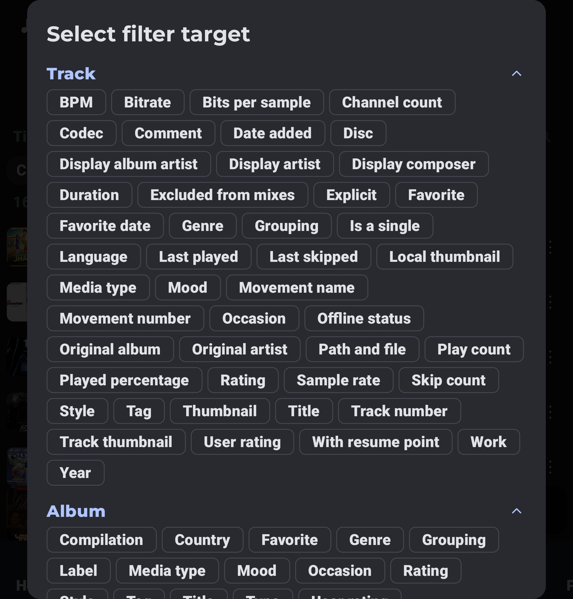 If need to filter track on tracks page by album there is no option available in filter
