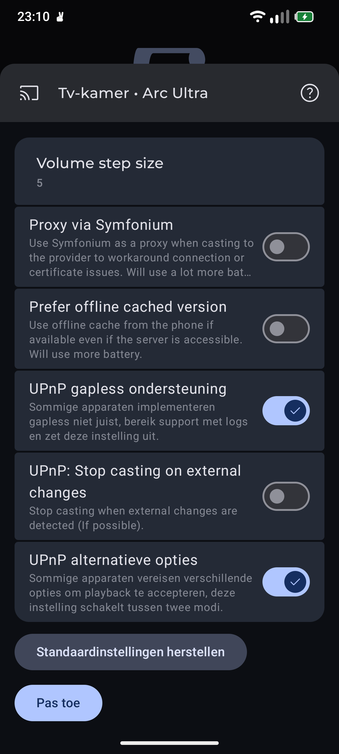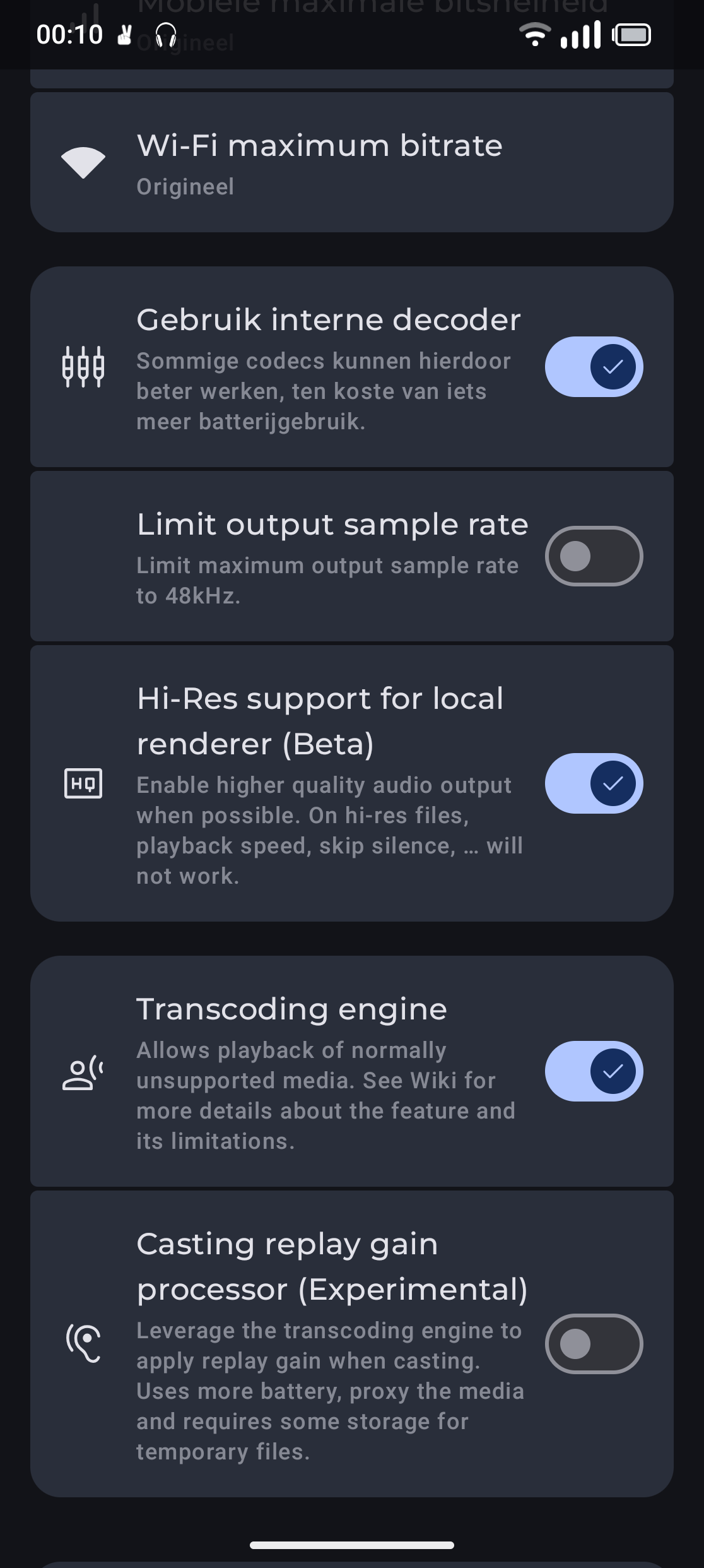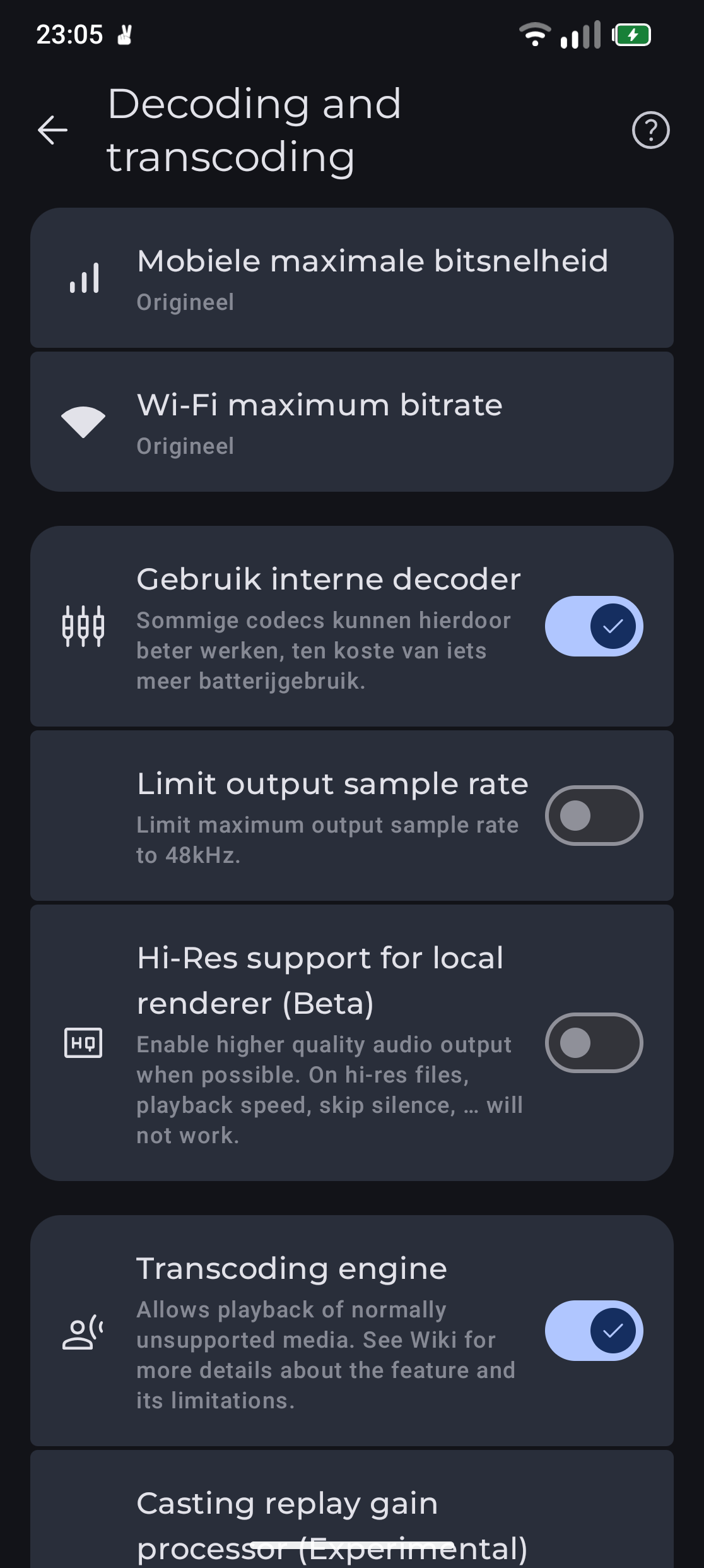 Hi there, i can send music to my Sonos speakers up until 48khz perfectly. But above that samplerate symfonium should be able to transcode everything to 48khz to let Sonos playback the music. Bit the transcoding doesn’t happen. I also seem to be missing the options to set max sample rate of bit depth for said transcoding. Please help, I love this app but most of my music on my phone or Google Drive has a higher samplerate than 48khz and I need to be able to transcode that. I also tried with UAPP and that works with the transcoding, bit I actually prefer your app. Hope you can help. Kind regards, Bart