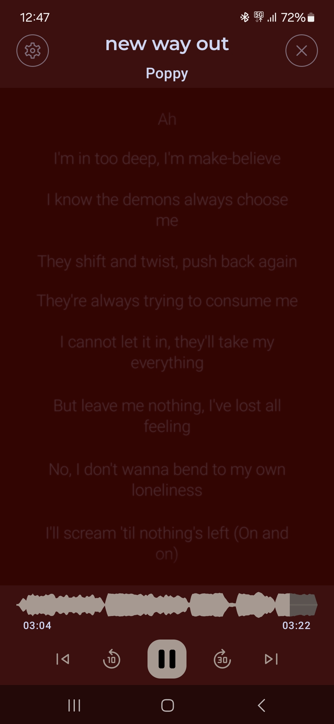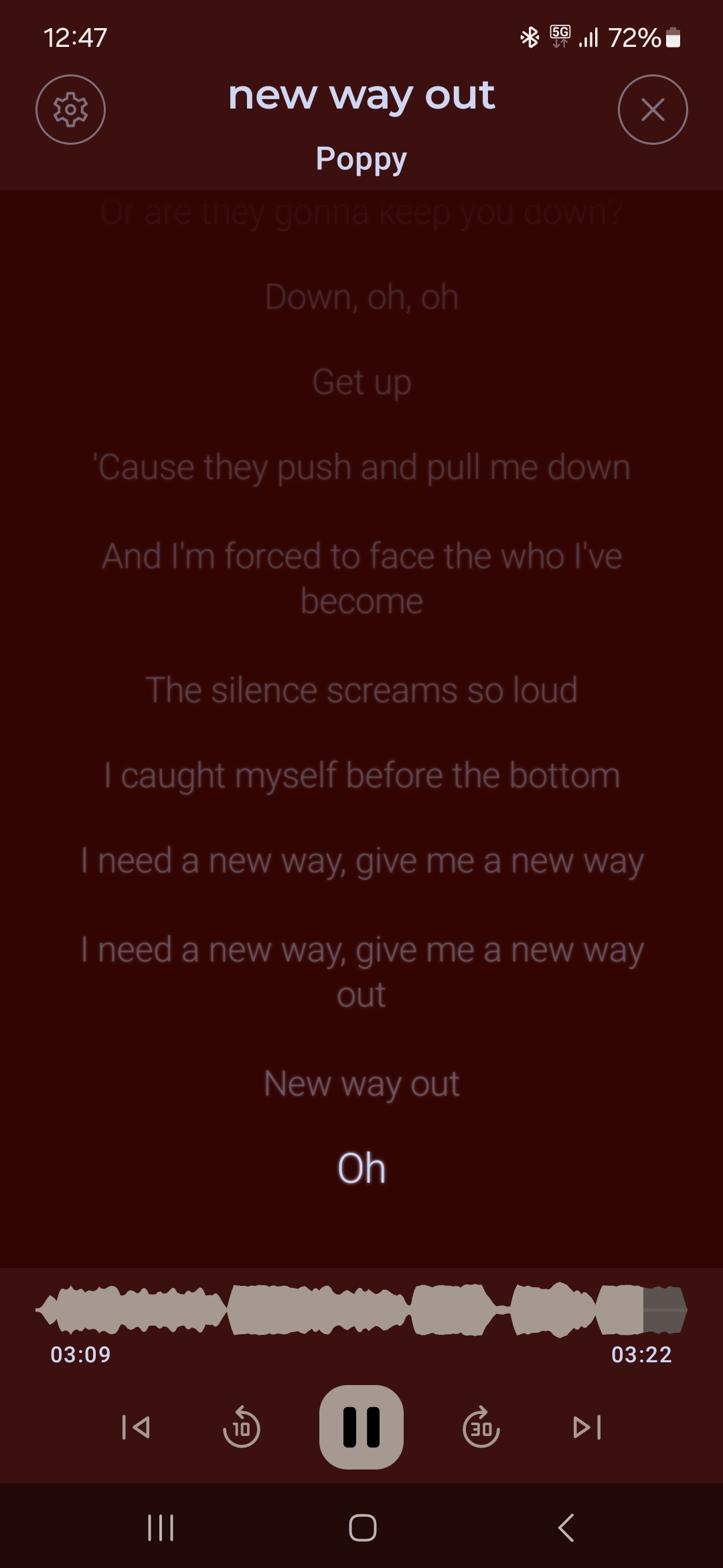 - Lyrics view opens at the bottom, with the last line highlighted and all other lines greyed out.